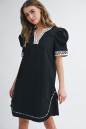 Black Leopard Trim Notched Neck Short Puff Sleeve Shift Mini Dress